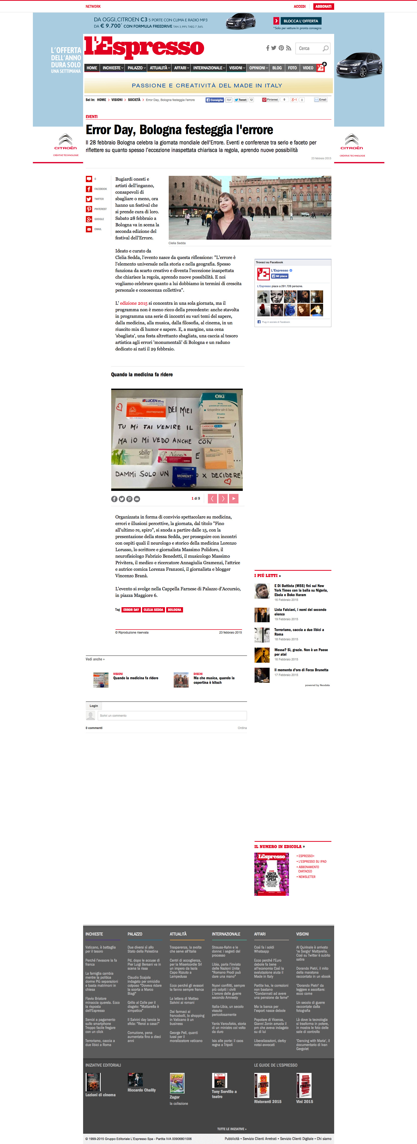 L' edizione 2015 si concentra in una sola giornata, ma il programma non è meno ricco della precedente: anche stavolta in programma una serie di incontri su vari temi del sapere, dalla medicina, alla musica, dalla filosofia, al cinema, in un riuscito mix di humor e sapere. E, a margine, una cena 'sbagliata', una festa altrettanto sbagliata, una caccia al tesoro artistica agli errori 'monumentali' di Bologna e un raduno dedicato ai nati il 29 febbraio.